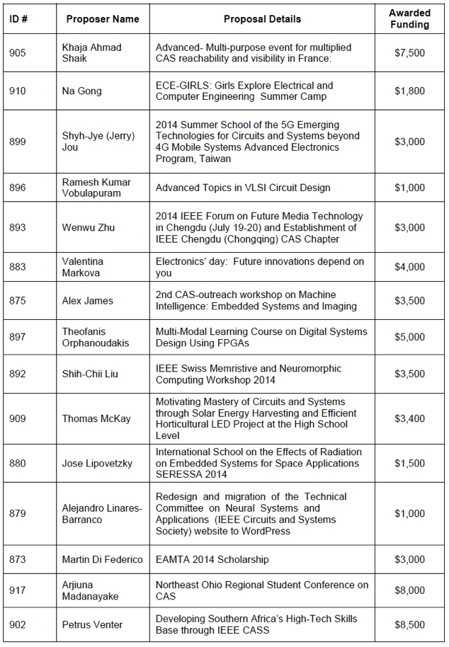 The second call of the CASS Outreach Initiative 2014 has now closed and all proposals have now been evaluated and ranked by the CASS Finance BoG division. We received 30 proposals all of extremely high quality from individual CASS members, Chapters from almost all regions and Technical Committees. All proposals were read and evaluated by each of the BoG Finance Division member and then ranked. Unfortunately limited funding was available so we were able to fund the 15 proposals listed below.
