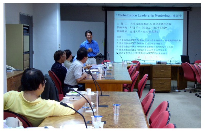 A recent "Globalization Leadership Mentoring" Panel has been successfully held at the National Chiao Tung University campus on November 10, 2006, and has lasted for more than 2 hours. The attendees are with very diverse backgrounds within iEEE (with members from Circuits and Systems Society, Computer Society, Communications Society, and Solid-State Circuits Society). In addition, Dean of Academic Affairs (who is from Department of Foreign Languages and Literatures), and Dean of Engineering College (who is from Department of Civil Engineering) also participated. Three professors came from a different city. They are Profs. Bill Tai, Justin Lai, and John R. Chen of National United University in Miaoli City.
