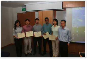 Photos (above): CAS student member speaker Mr. R. Mahesh presented his research to the audience during the graduate student workshop on September 25, 2007 AND the five student member speakers received the certificates from CAS Singapore Chapter Chair Prof. Lin at the end of the workshop.